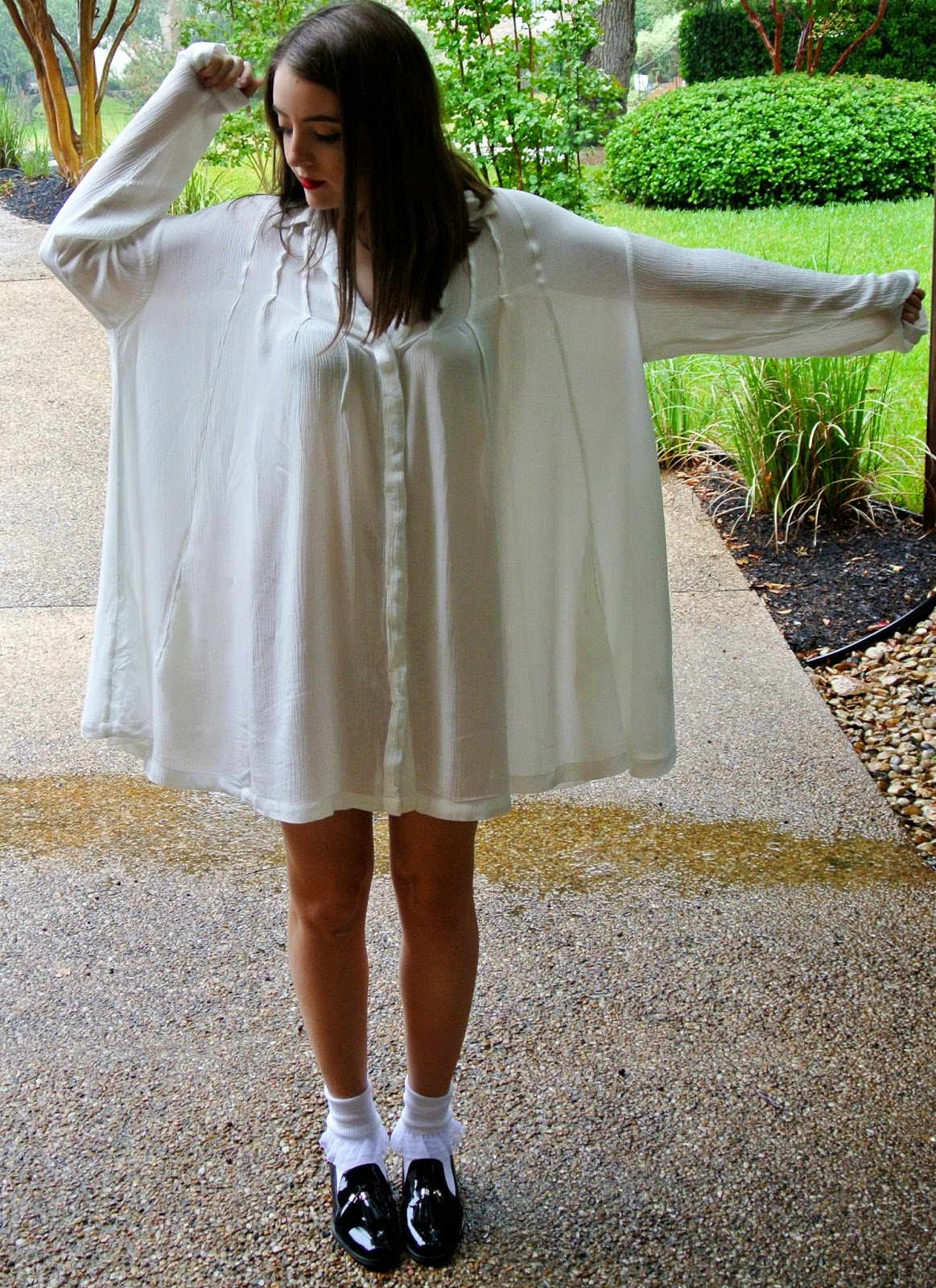 I love incorporating masculine pieces into my outfits and making them look feminine. Today, I matched an over sized mens dress shirt with a pair of frilly socks and shiny loafers. It's the perfect Friday look, especially because on Fridays I roll out of bed at the last minute and have already mentally checked out from the previous week. On Fridays I just want to be comfortable, and as I stomped down the street in my loafers, away from my morning classes and back to my bed, I couldn't help but notice how many young women I passed wearing basketball shorts, messy buns, and yesterdays eye makeup smudged all over their faces. I realized that Friday is a CAN'T EVEN day. It is the one day a week that students are not ready to deal with. They are so ready for the weekend that they can't even deal with the Friday classes ahead of them. With this outfit, I am here to help with that Friday "cant even" slump. It is so easy to look adorable and be extremely tired at the same time. The shirt dress is the one piece every girl who can't deal with Friday should own. The shirt dress is every girls best friend. It is comfy, cute, and easy to put on at 8 A.M. and easy to get off for your nap at Noon. Ladies if you are going to listen to any of my fashion advice, listen to the shirt dress advice. I thank this piece every day for existing.